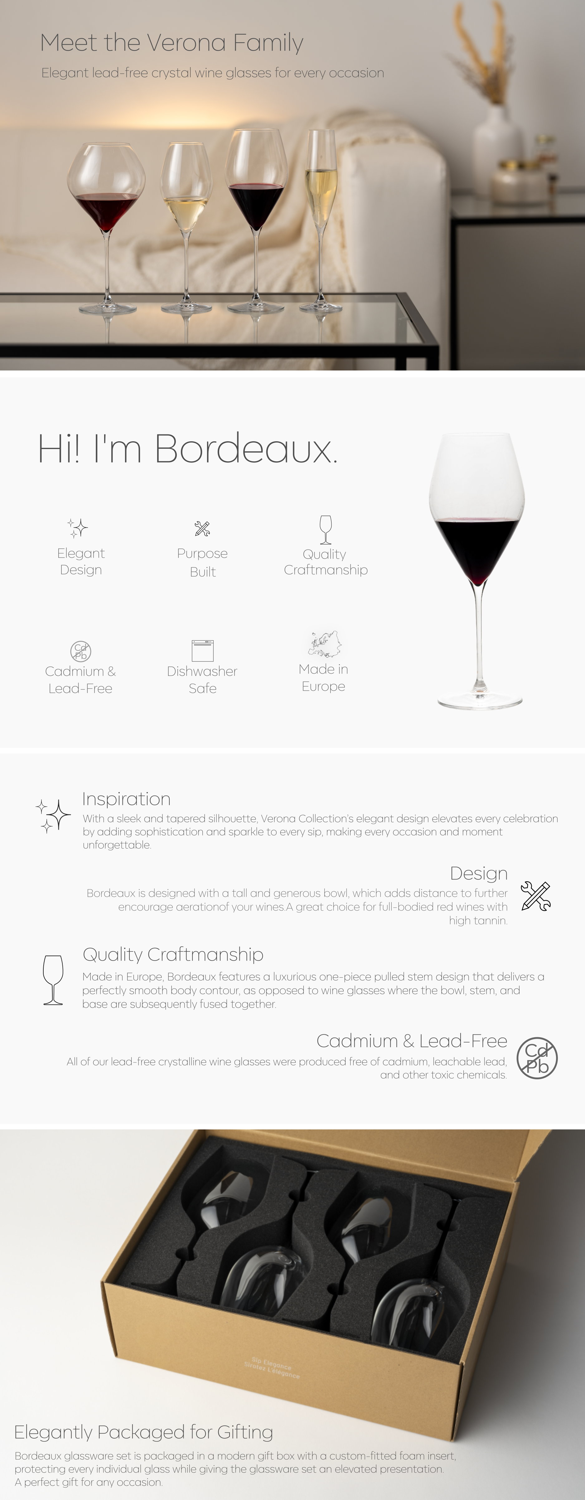 Bordeaux glassware set is packaged in a modern gift box with a custom-fitted foam insert, protecting every individual glass while giving the glassware set an elevated presentation. A perfect gift for any occasion.